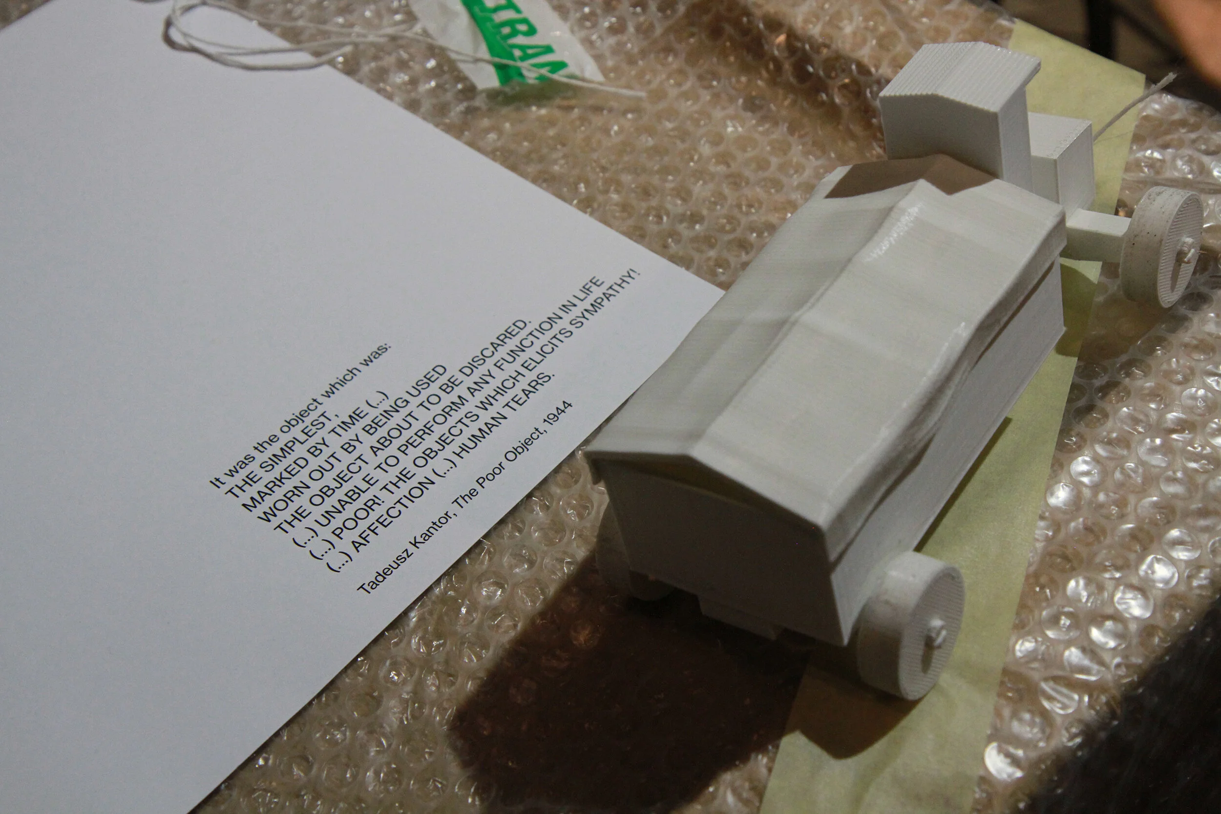 In 2018, Muzeum Etnograficzne in Kraków opened an exhibition, “Widok zza bliska. Inne obrazy Zagłady”, about the objects which tell the story of World War II. One of these objects is called TRUPOSZNICA, Franciszek Wacek’s object/corpse carrier from Treblinka that was used to illustrate wartime stories he told to local children. In February 2019, in collaboration with the Cricoteka and curators of the exhibition (Erica Lehrer, Roma Sendyka, Wojciech Wilczyk, and Magdalena Zych), the “Staging Difficult Pasts” research team invited Ludmiła Ryba to conduct a week-long workshop with the Kolektyw Kuratorski about objects, based on her experience with the theatre of Tadeusz Kantor (February 18-22). The Kolektyw carefully researched historical questions connecting the city's topography, the object and the performance sites and curated a performative intervention in the Kantor Museum. Alongside the workshops, theatre maker and visual artist Wojtek Ziemilski was commissioned to create a performative action of moving TRUPOSZNICA from the Muzeum Etnograficzne to Cricoteka (February 23).
